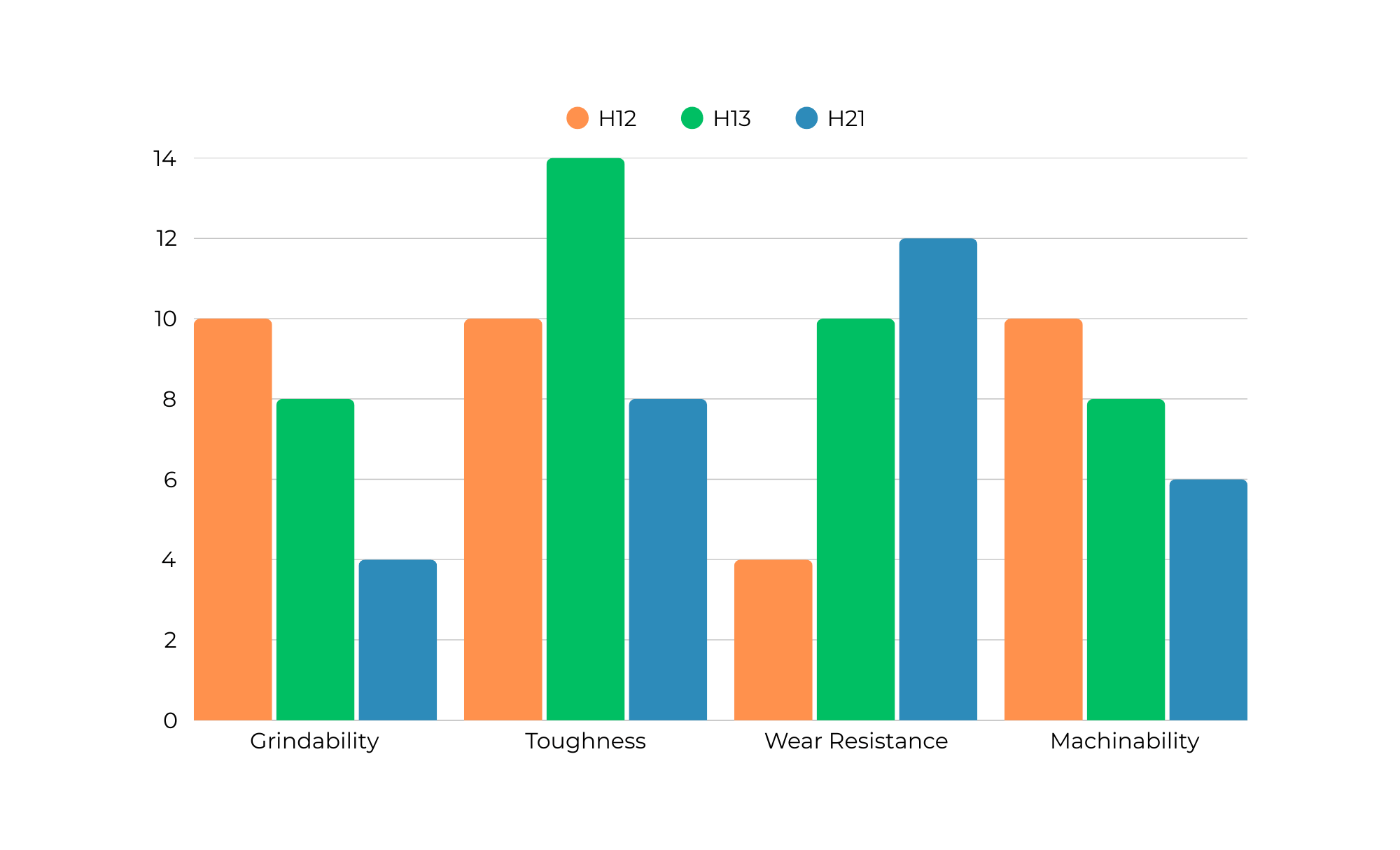 • Hardening: H13 tool steel is a steel having very high hardenability and should be hardened by cooling in still air. The use of a salt bath or controlled atmosphere furnace is desirable to minimize decarburization, and if not available, pack hardening in spent pitch coke is suggested. The temperature employed is usually 1800°-1850°F, depending on size section.